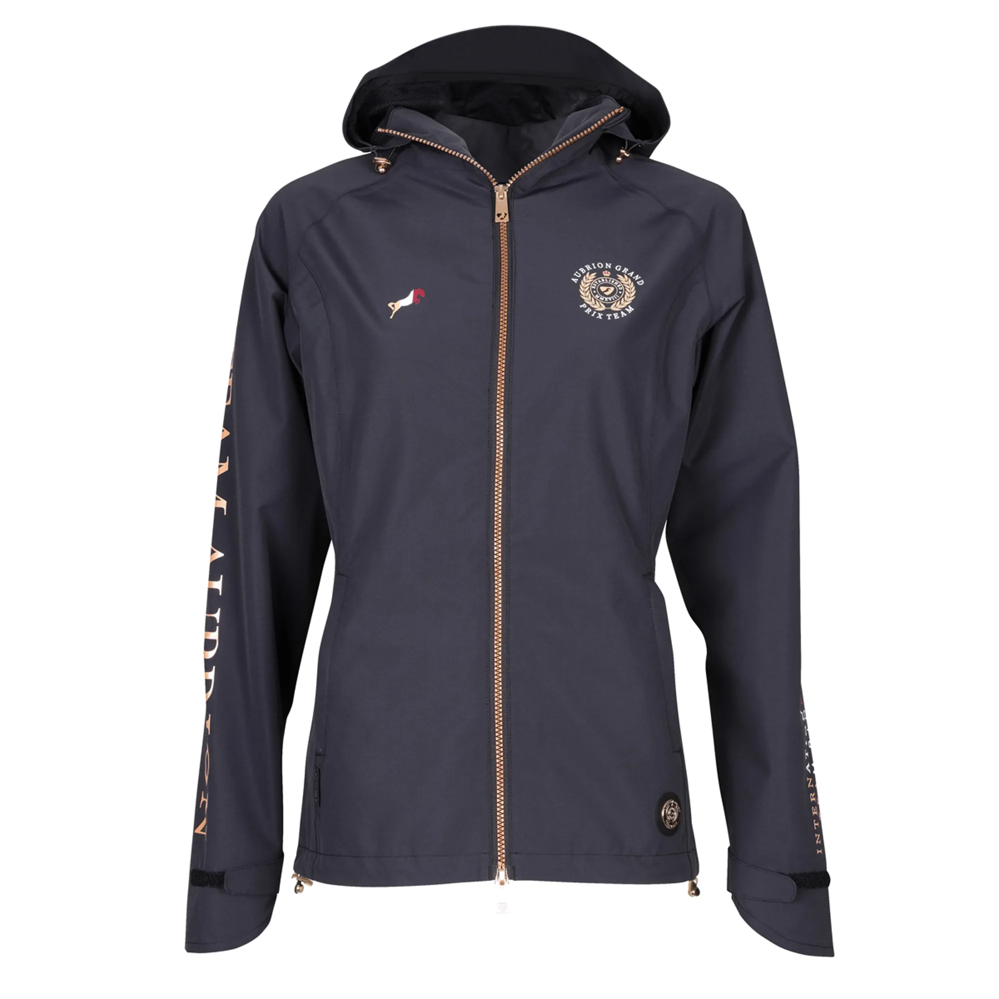 The Shires Aubrion Team Waterproof Jacket lets wet weather layering gets stylish. Designed with a flattering figure skimming fit, the waterproof outer is lined in breathable climate control mesh with taffeta lining to the arms. A two way front zip offers a flexible fit in or out of the saddle. Twin metal adjusters allow shortening of an elastic bungee. A lined hood features bungee adjusters; adjustable cuffs feature stretch inner wrists.