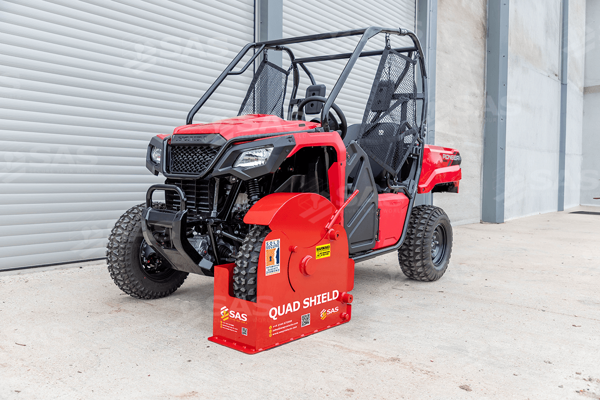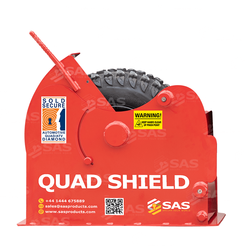 SAS have designed and launched the new Quad Shield Wheelclamp locking system, primarily to protect ATVs and UTVs from the growing theft problems owners are encountering. The clamp system, bolted to the ground, allows you to drive your ATV or UTV into it.